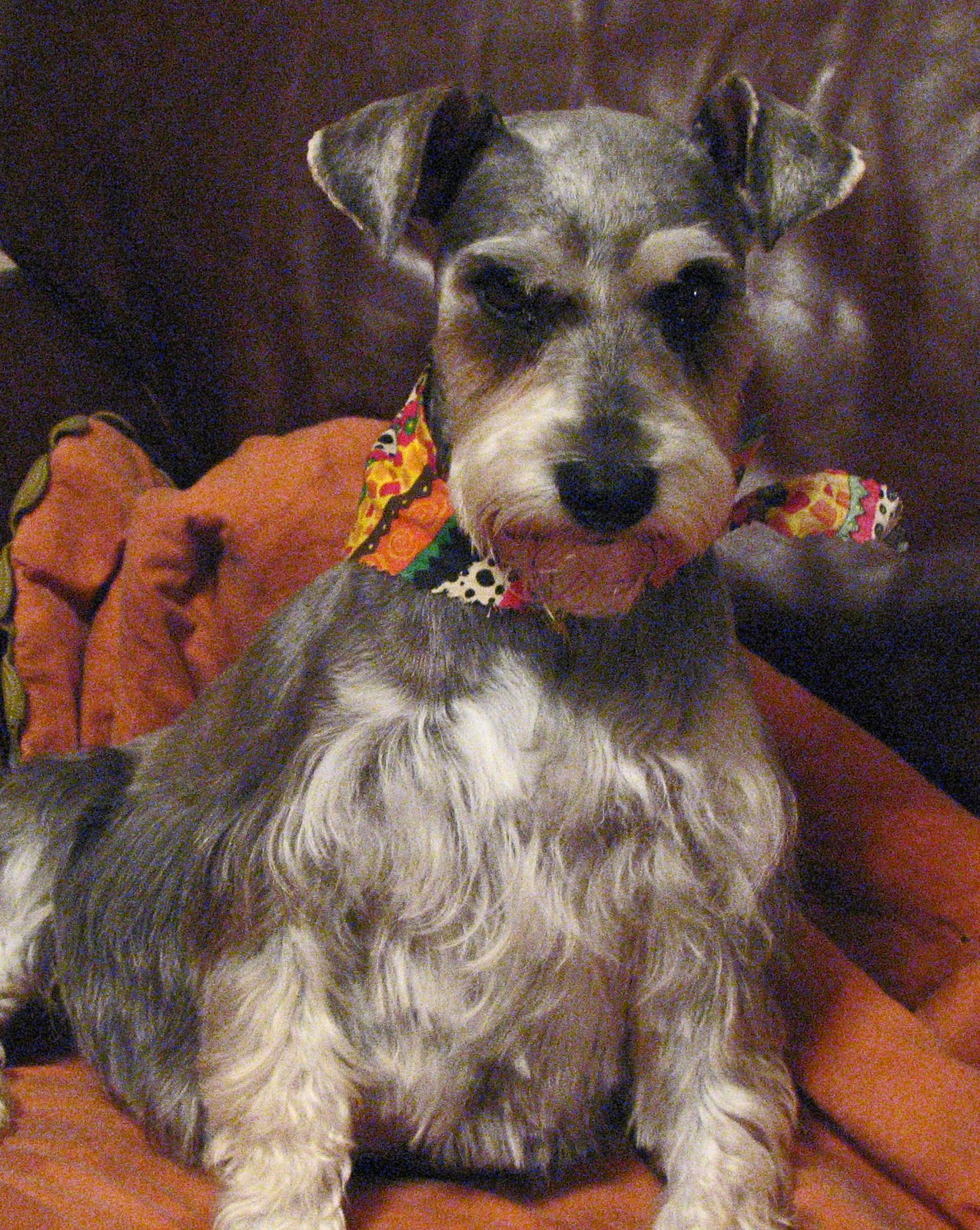 Scoob-E is also a dark chocolate color with white on his chest, the tips of his toes and a light goatee on his chin.